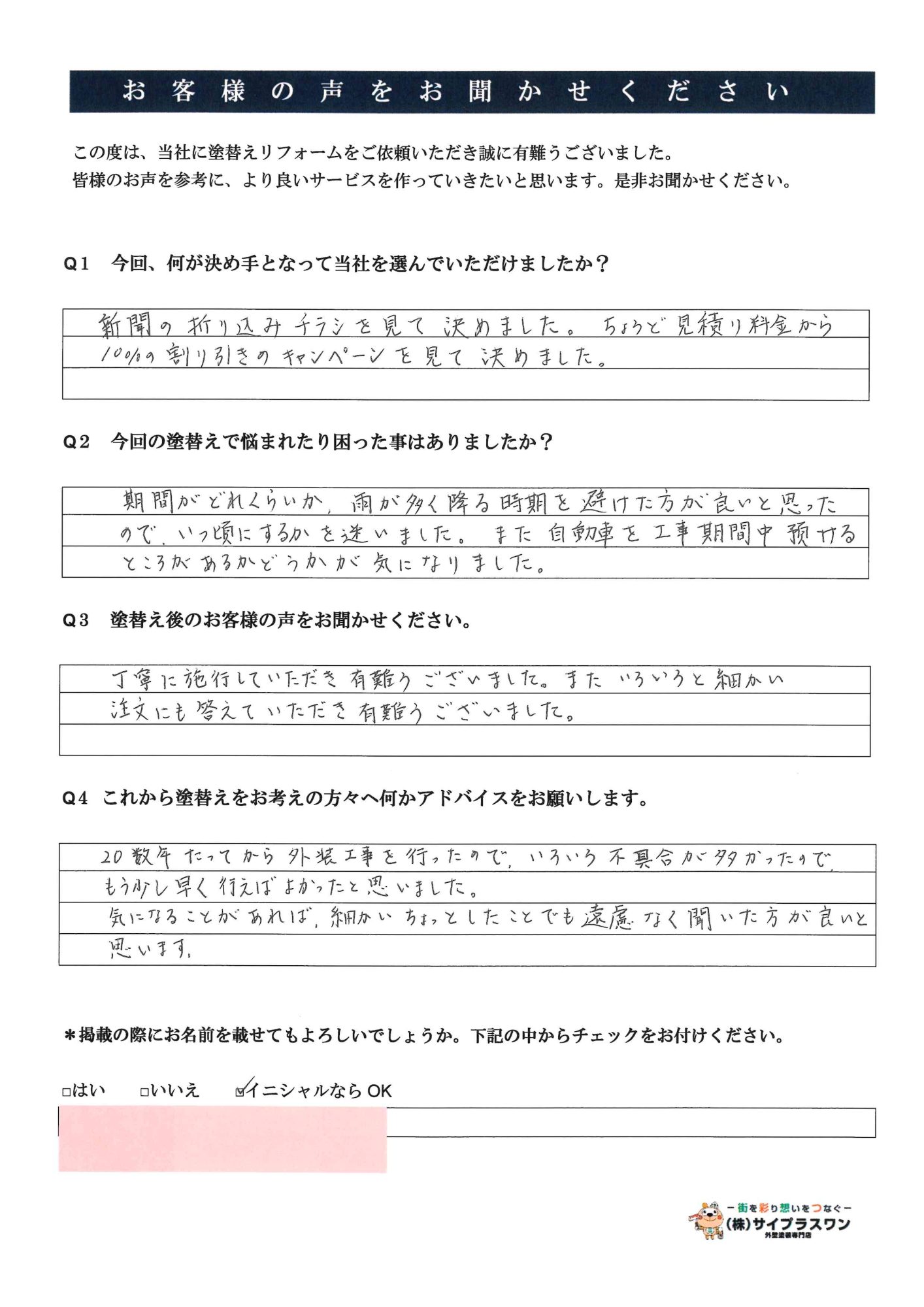 そんな時、サイプラスワンさんのチラシが投函されていたので問い合わせをしてみた所、迅速な対応と見積書も素人の私でも非常に分かりやすく明確な見積書、納得の価格帯ということもあり今回工事依頼をさせてもらいました。