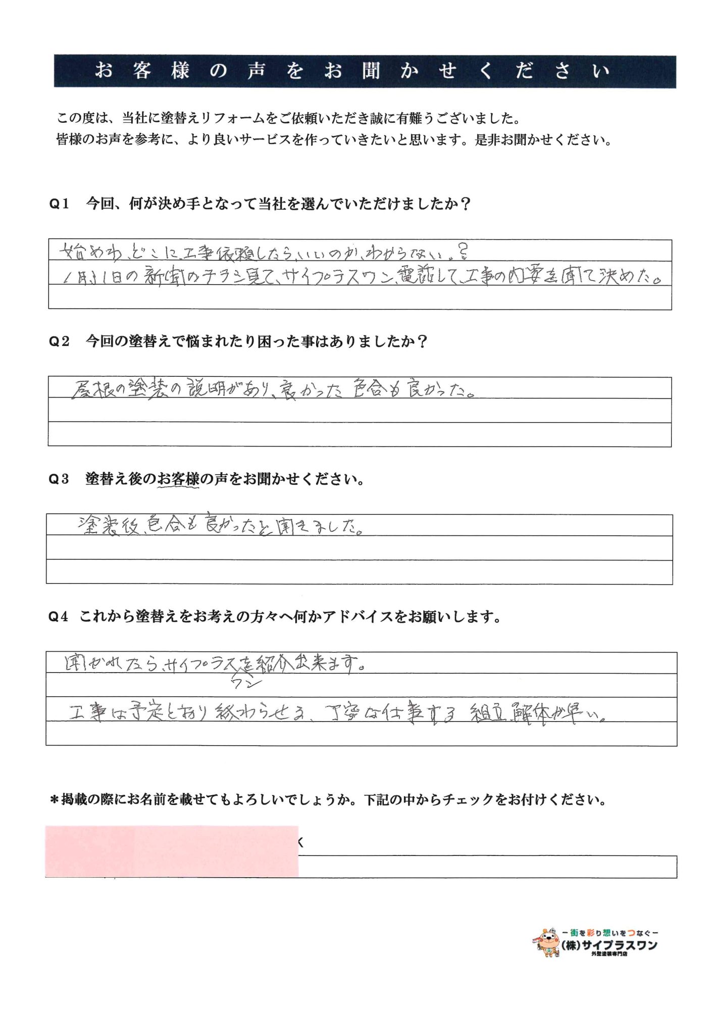 そんな時、サイプラスワンさんのチラシが投函されていたので問い合わせをしてみた所、迅速な対応と見積書も素人の私でも非常に分かりやすく明確な見積書、納得の価格帯ということもあり今回工事依頼をさせてもらいました。